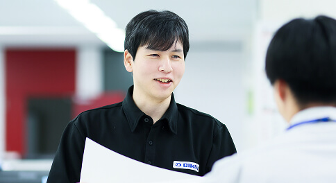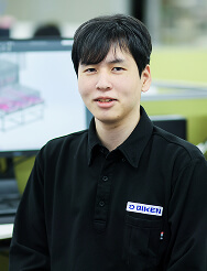 大学では機械関係を専攻していました。就職活動は機械設計の専門知識を活かせる地元メーカー企業に絞り込んで行い、技研という会社の存在を知りました。少子高齢化が進む中、日本のものづくりの現場では人手不足が大きな課題になっています。これに対し、技研は「搬送」の技術を大きな強みとして、大手自動車メーカーやアルミメーカーの生産ラインの自動化、省人化につながる装置を開発しています。これからの成長性に魅力を感じたこと、そして身近なところではきれいな社屋と明るい雰囲気に惹かれて入社を希望しました。